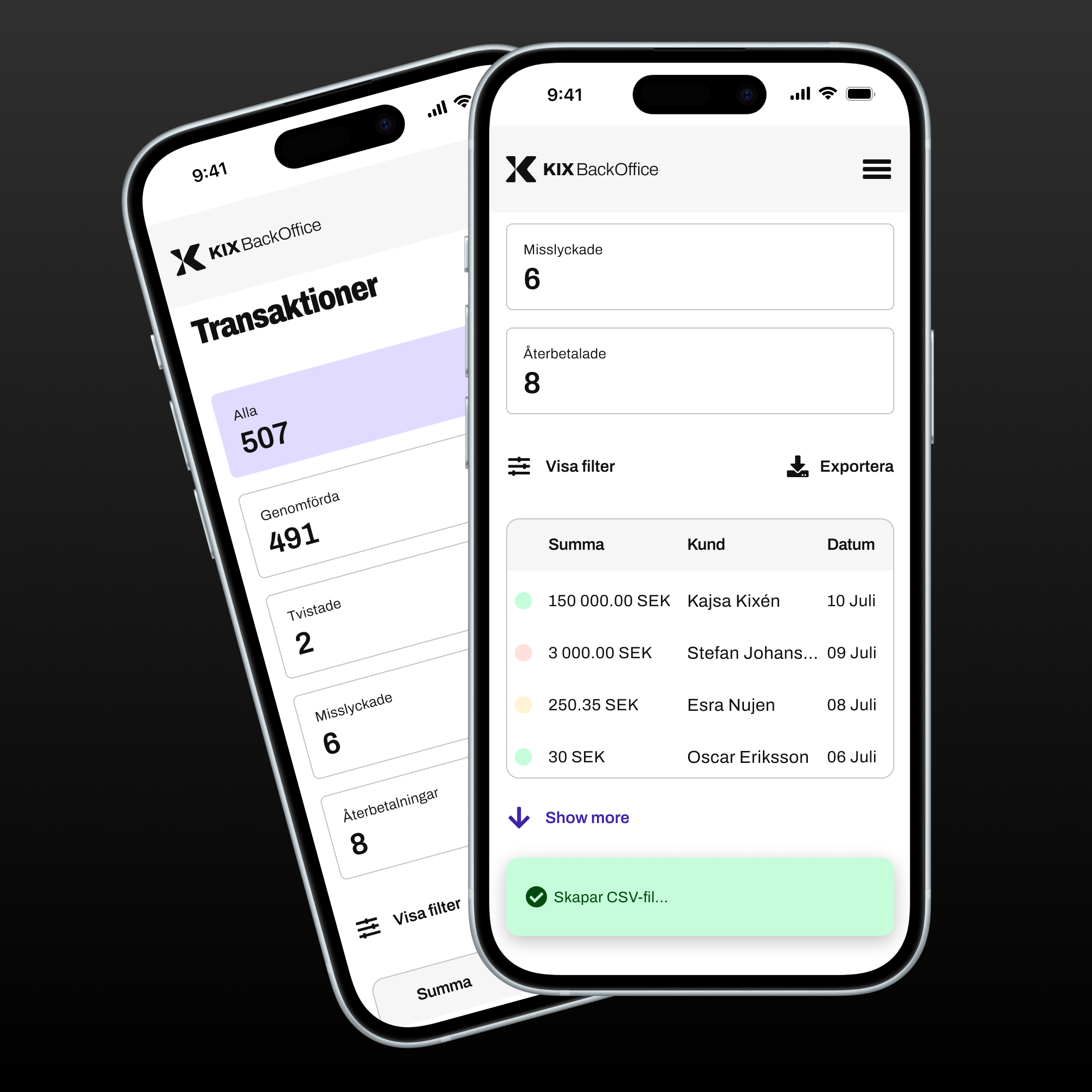Följ alla transaktioner, filtrera och följ statistik i Kix Backoffice. Du kan även exportera transaktionerna till CSV format för din redovisning.
